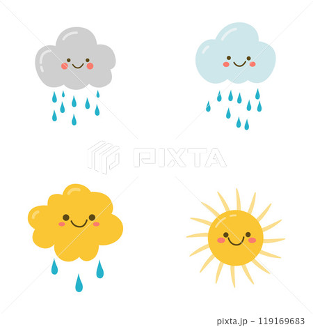 Set of Cute Rain Cloud Sun Cartoon Character in the Sky