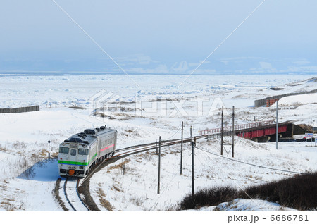 流氷が押し寄せたオホーツク海と海別岳をバックに網走駅へ向かう「流氷物語」号