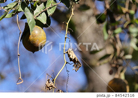 自然 植物 キカラスウリ、梢から垂れ下がった丸くて黄色い実。葉も黄葉しています