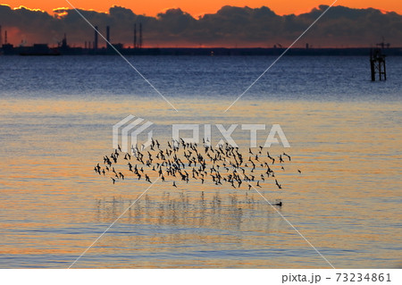 海面を飛ぶ鳥の群れ(ハマシギ)