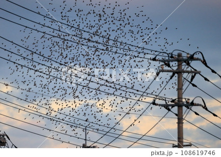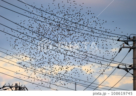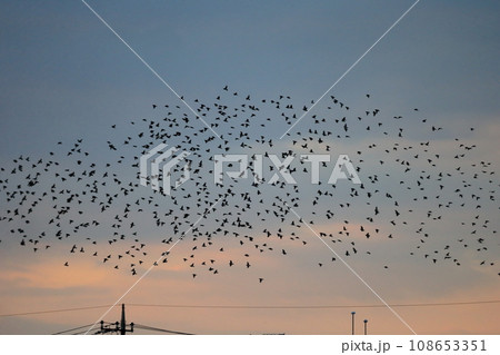 夕暮れ時の鳥の群れ(ムクドリ)