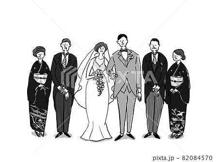新郎新婦と親族、両親、(花嫁:ドレス3 義母、母:和装)洋装、ウエディングドレス、結婚、ウエディング