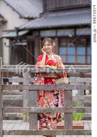 振袖を着たウサギと赤い青海波模様背景のイラスト(文字なし)【年賀状テンプレート(卯年)】