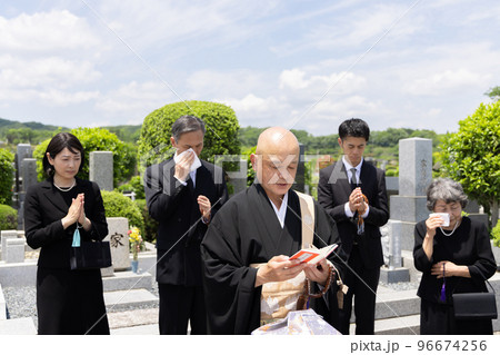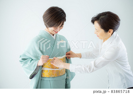 イラスト素材:着物姿の家族4人が正座でご挨拶のセット 水色の霞柄
