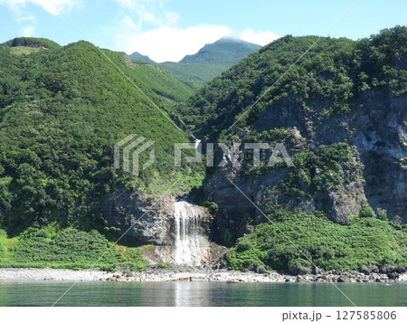 知床観光船おーろらから見たカムイワッカの滝と知床硫黄山