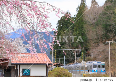 秩父鉄道「桜咲く春の武州日野駅に到着した電車」