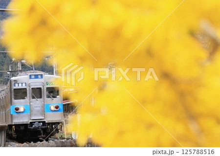 秩父鉄道「黄色いレンギョウの花と電車」
