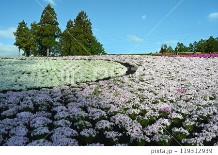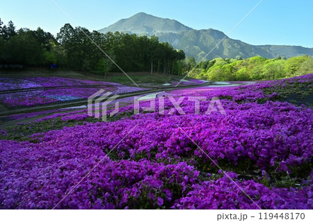 秩父市羊山公園の芝桜の丘に咲く芝桜に新緑の木
