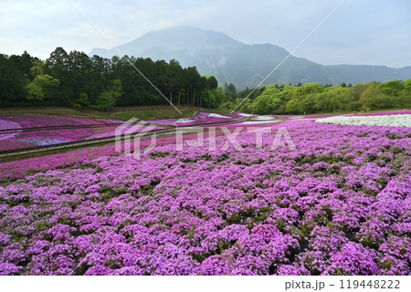 秩父羊山公園の花咲く芝桜の丘に霧かかる武甲山