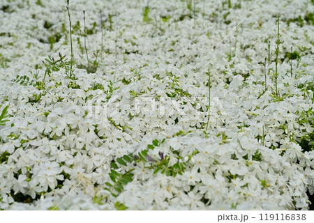 秩父市羊山公園の芝桜の丘に咲く芝桜に水滴付くスギナ