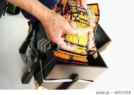 端午の節句・鎧飾りを出すジイジの手縦位置