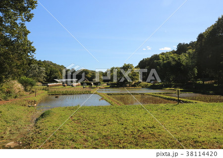 実りの秋の狭山丘陵 青空の稲刈りのころの岸たんぼ