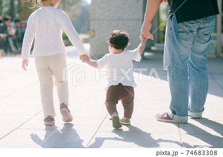 手をつないで家族と歩く赤ちゃん 後ろ姿
