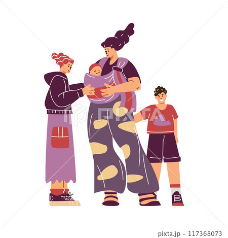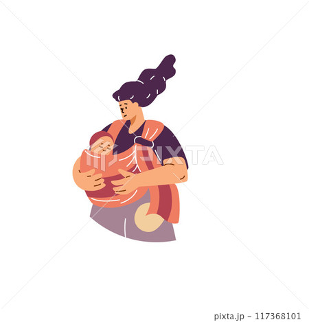 Family walk vector illustration. Mom with a newborn baby in a carrier.