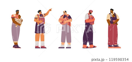 Happy young gay father carrying baby in sling, vector couple of homosexual men parent with infant in baby carrier wrap