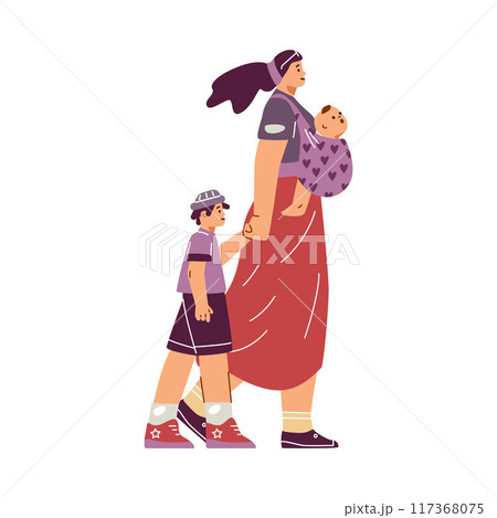 Happy young mother carrying baby in sling, vector parent walking with infant in baby carrier wrap and holds son's hand