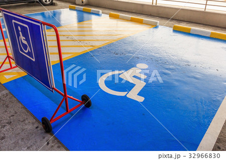 Handicap symbol on road, pedestrians on parking