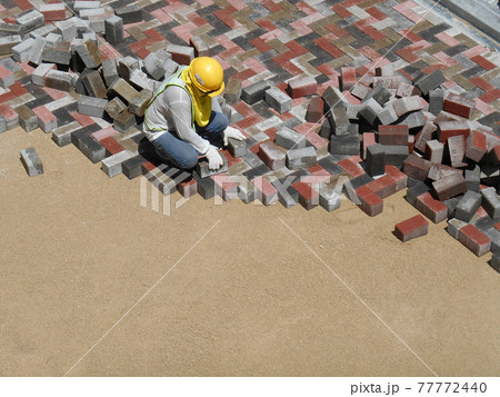 MALACCA, MALAYSIA -MAC 08, 2017: Construction workers installing and arranging precast concrete pavers stone for the road at the construction site.