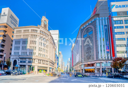 銀座 歩道 和光 買い物 人混み 中央区 夕方 午後 都心 東京 道路 高層ビル 車 三越 夜