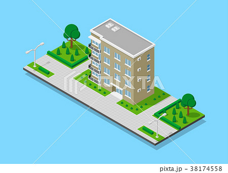 Isometric city. Top view of districts and roads. Cartoon buildings and highways. Facades of multistory houses or streets with crosswalk and traffic lights. Vector cityscape illustration