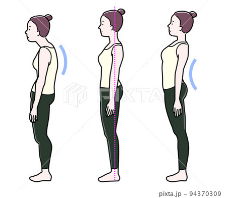 姿勢改善 姿勢矯正 猫背 ストレートネック 骨盤後傾 骨盤前傾の女性のイラスト 全身横向き