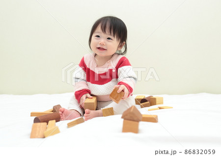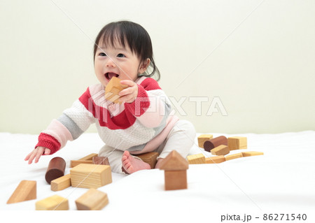 積み木で遊ぶ0歳の赤ちゃんの女の子