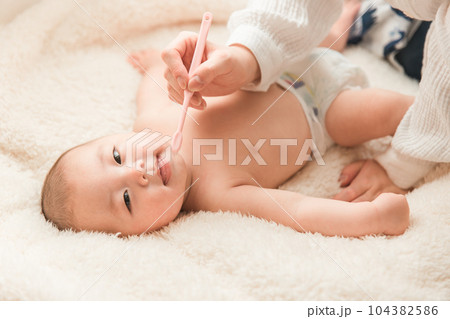 赤ちゃんの歯磨き・歯をブラッシングするママ・母親(予防歯科)