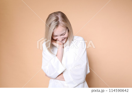 大笑いする男性と女性 仲良し夫婦 男の人 女の人白背景 ポートレート バック コピースペース
