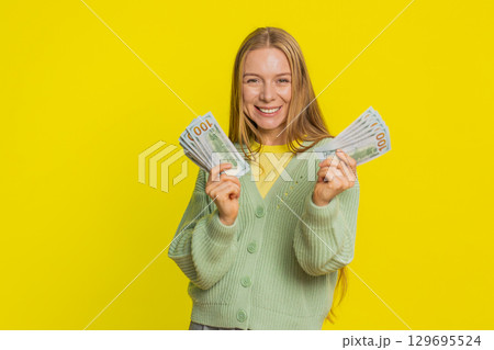 Excited happy business woman holding fan of dollar cash celebrate success big income, wealth, salary