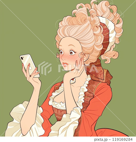 A classical Greek-style statue of a woman gazes at a smartphone against a pastel pink background