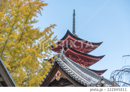 【広島宮島 厳島神社の五重塔と紅葉】