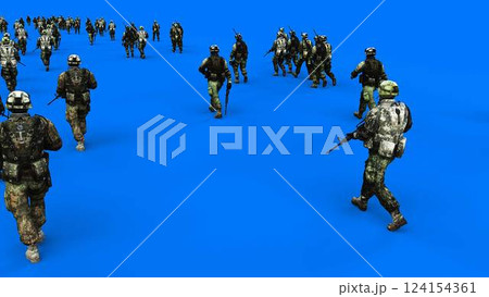 a crowd of walking soldiers with weapons. green screen. War, conflict concept. 3d rendering