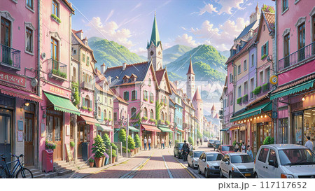 A charming village in Albania features stone buildings with terracotta roofs and vibrant flowers. A castle overlooks the cobblestone street, showcasing the beauty of the region.