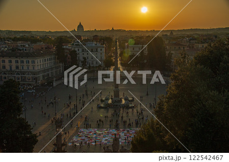 Eternal flame at the memorial with burning flame against the background of the city square. Pigeons sitting on the paving stones in the park.