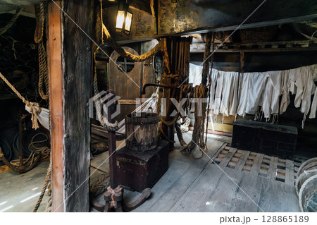 Pirate flag with skull and crossed swords beside lit candle and metal mug on wooden table creating warm cozy atmosphere