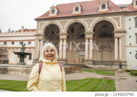 A female tourist walks around along a decorative alley decorated with many statues in a decorative park at Wallenstein Palace building in Prague in Czech Republic