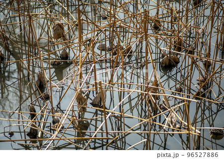 水が温み多数の枯れた蓮の茎の中に少し残っている葉と実・枯蓮