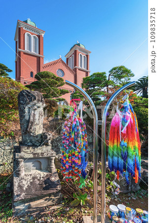 [九州・長崎] カトリック浦上教会の元に立つ被爆遺構と千羽鶴。