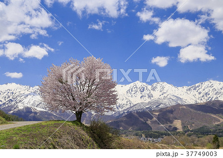 白馬村野平地区からの満開の一本桜と雪の白馬岳