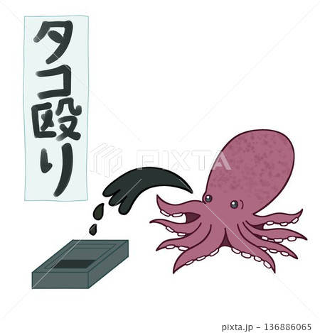 タコ殴りと書かれた書道作品 墨を吐くタコ 面白い 軟体動物 イラスト