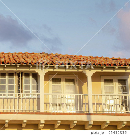 Square Puffy clouds at sunset Terrace of a mediterranean style house with US flag at La Jolla,