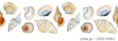 Watercolor seamless horizontal border with nautical seashells on white background in blue, orange, beige colors