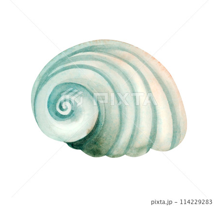 Turquoise green seashell of Cassidae sea snail watercolor illustration isolated on white background. Monochrome underwater animal for summer ocean designs. Nautical spiral helmet or bonnet snail shell
