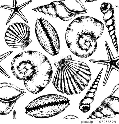 Seashell Pattern on isolated background. Hand drawn vector seamless linear ornament with Sea Shells for nautical wrapping paper or textile. Underwater illustration with cockleshell and scallop.