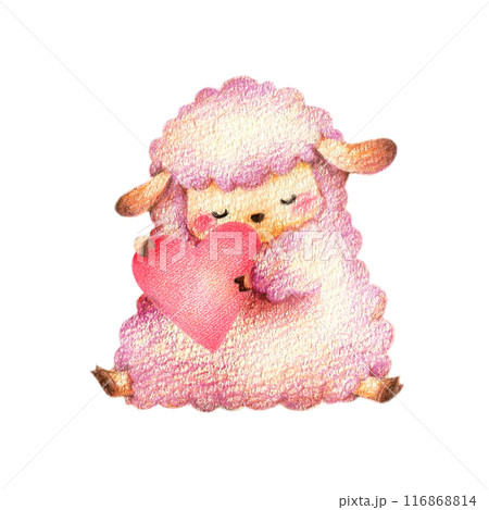 赤いハートを抱きしめて座るひつじ 手描き色鉛筆画