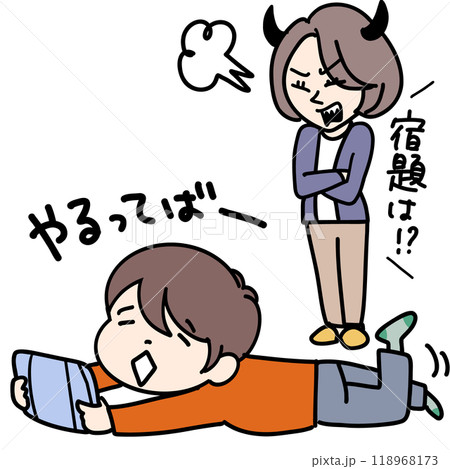 ゲームをやる子供の後ろで鬼の形相になって怒鳴る母