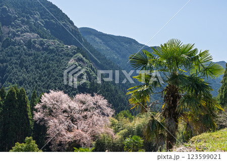パノラマ風景 毎床大桜(まいとこおおざくら)樹齢三百年 杉林の中に一本だけ咲いた山桜(人吉・球磨)