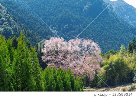 春日和に映える毎床大桜(まいとこおおざくら)樹齢三百年 杉林の中に一本だけ咲いた山桜(人吉・球磨)