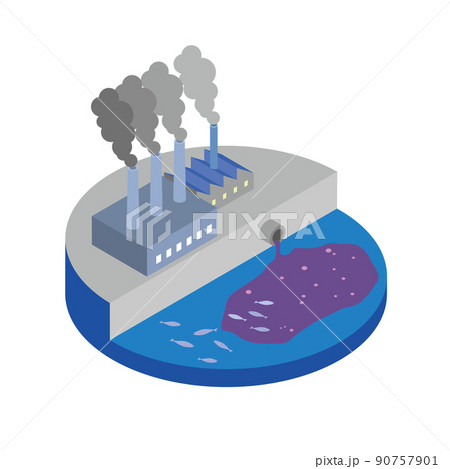 工場からの排水と煙で環境が破壊される公害のイメージ