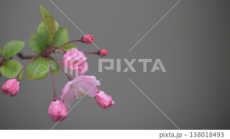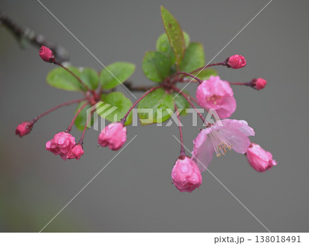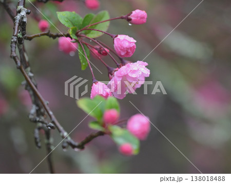 雨の日 古寺の境内に咲き始めた海棠(カイドウ)の花